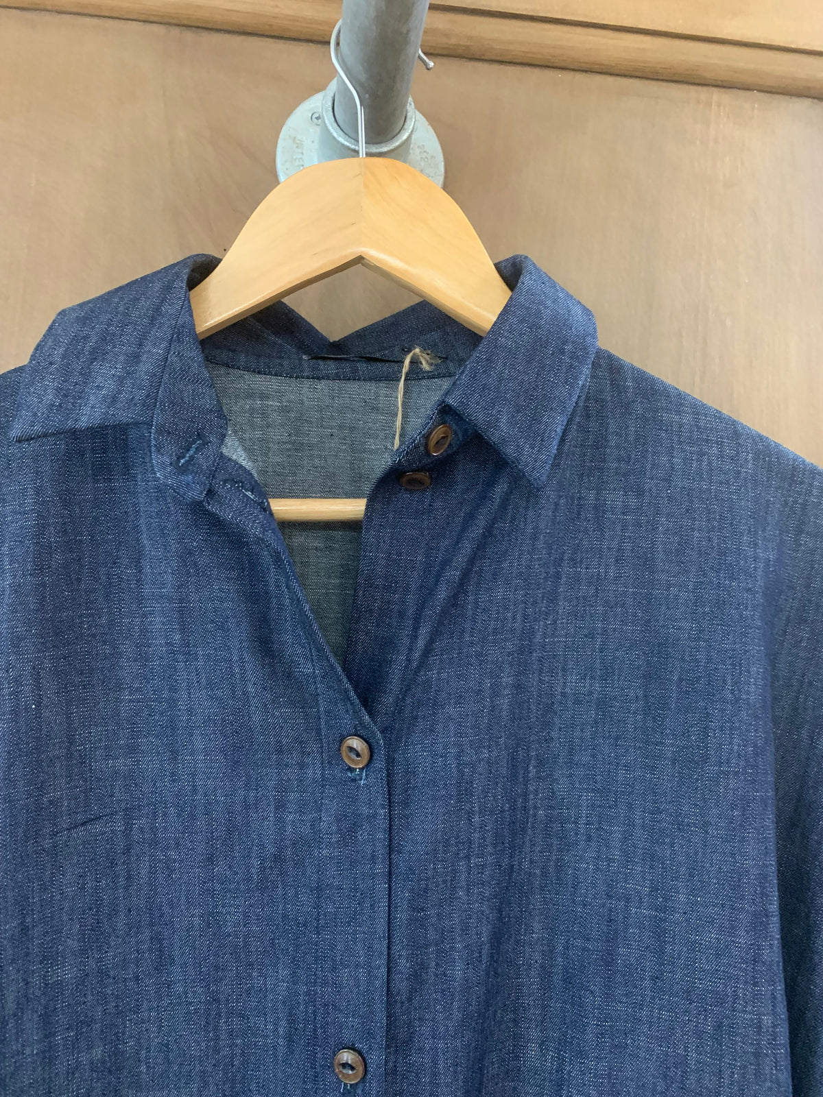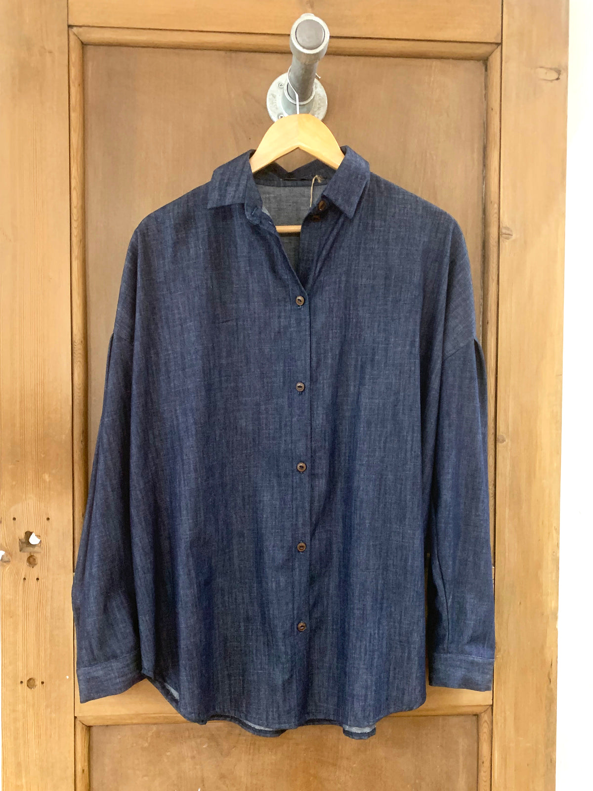 The Poet organic denim chambray collared shirt is designed to be artfully rumpled with a soft hand feel and vintage workwear aesthetic. This shirt features our signature full pleated sleeve and coconut shell buttons and is longer in length.