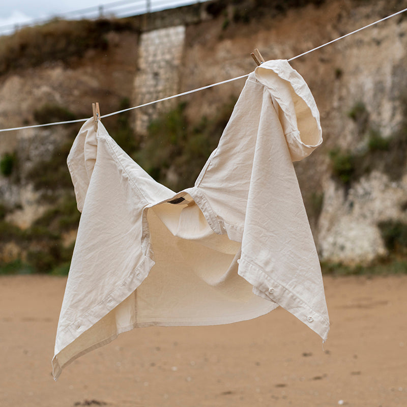 We make our pieces using unbleached fabrics and hand dye them in small batches in our Margate studio using low impact dyes. This allows us to offer an extensive range of colours. See our colours and read more about our dyeing process