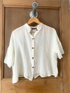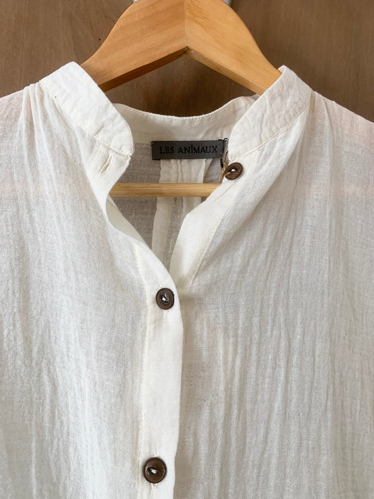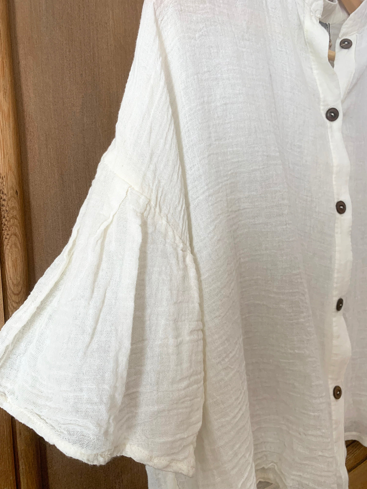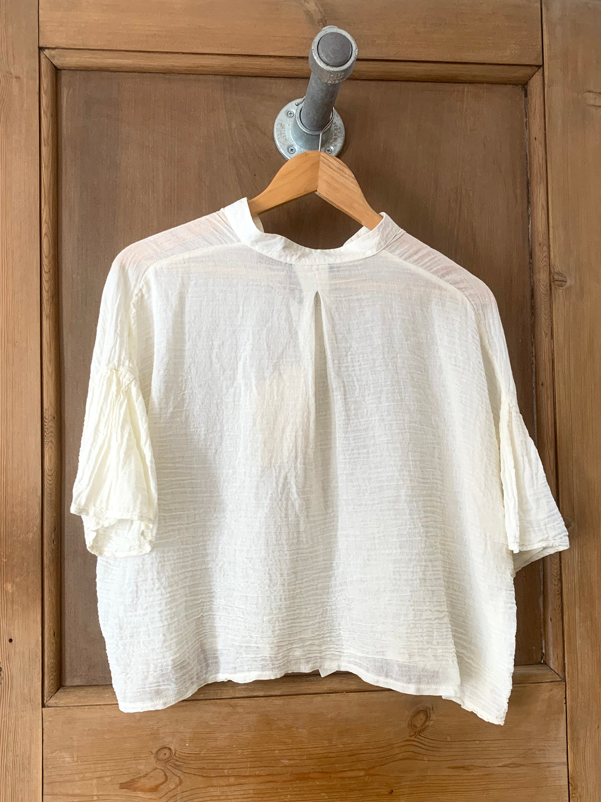 The Poet organic Indian cotton blouse features our signature full pleated sleeve and is a perfect layering piece. Designed to be artfully rumpled with a soft hand feel and coconut shell buttons.