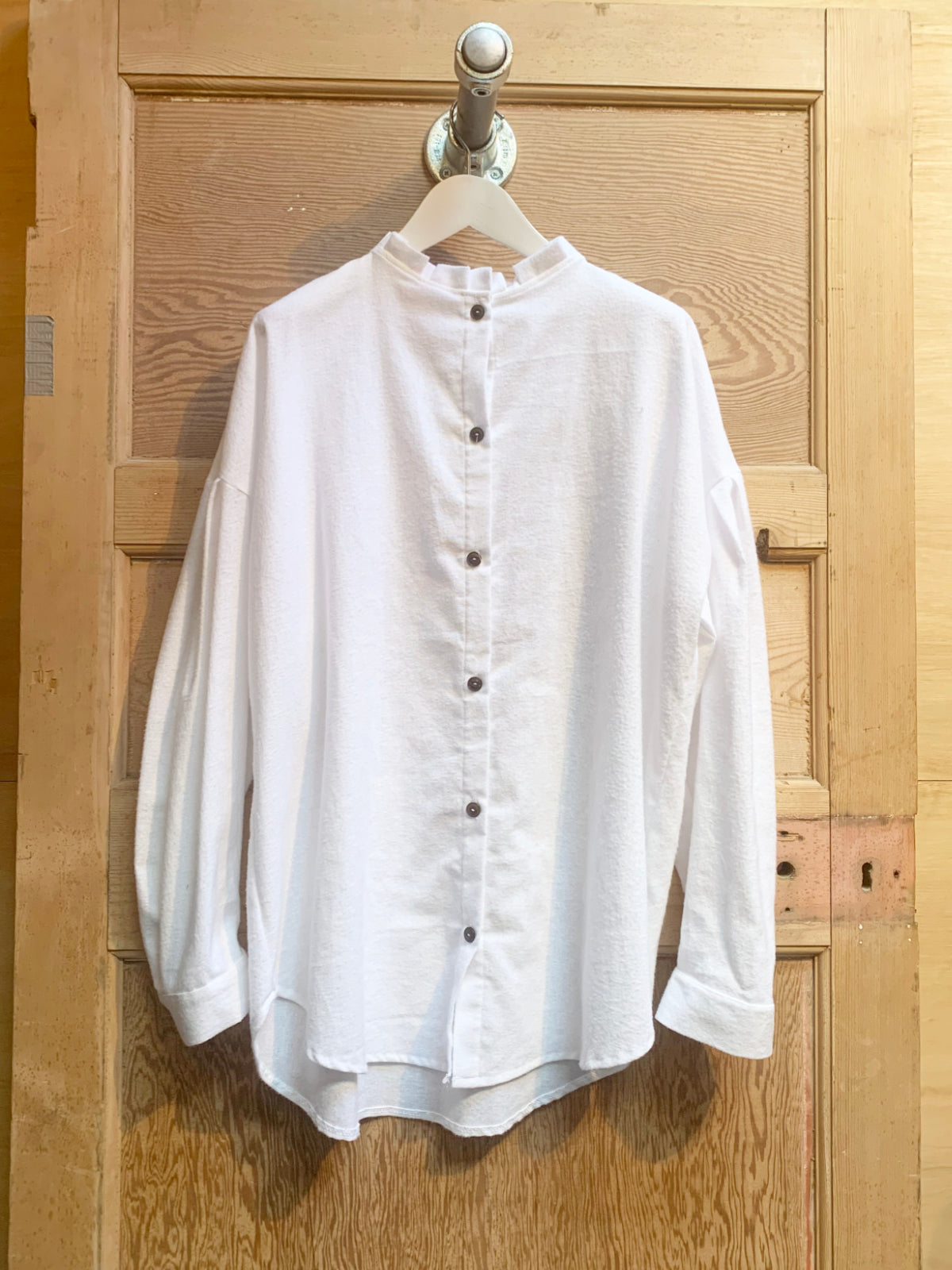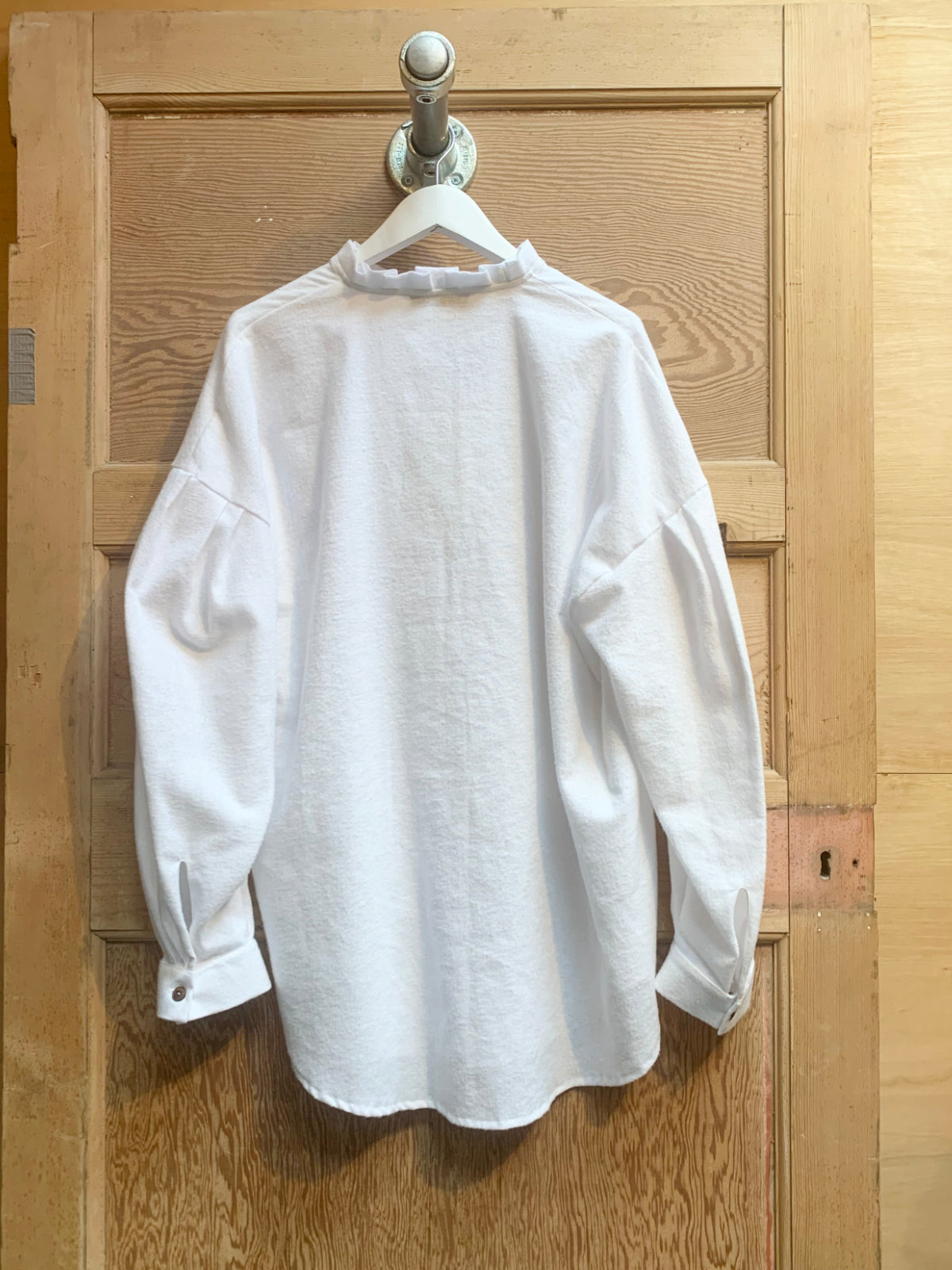 The Poet organic flannel shirt is made from a brushed mid weight cotton, woven in India. This shirt features our signature pleated Poet sleeve and a ruffle trimmed neckline.