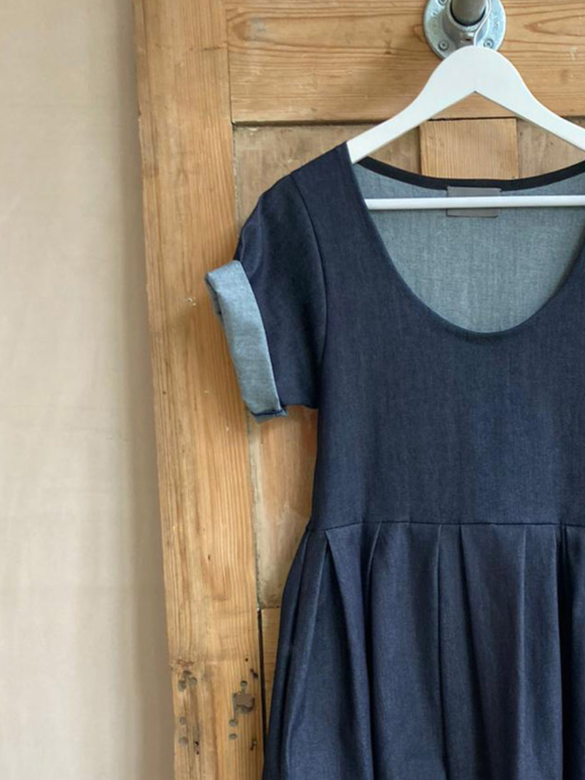 The Berry Picker dress is a timeless dress made from raw organic stretch denim and features a reversible neckline and sleeves that can be worn rolled up or down. Our denim composition is 97% Cotton 3% Elastane.