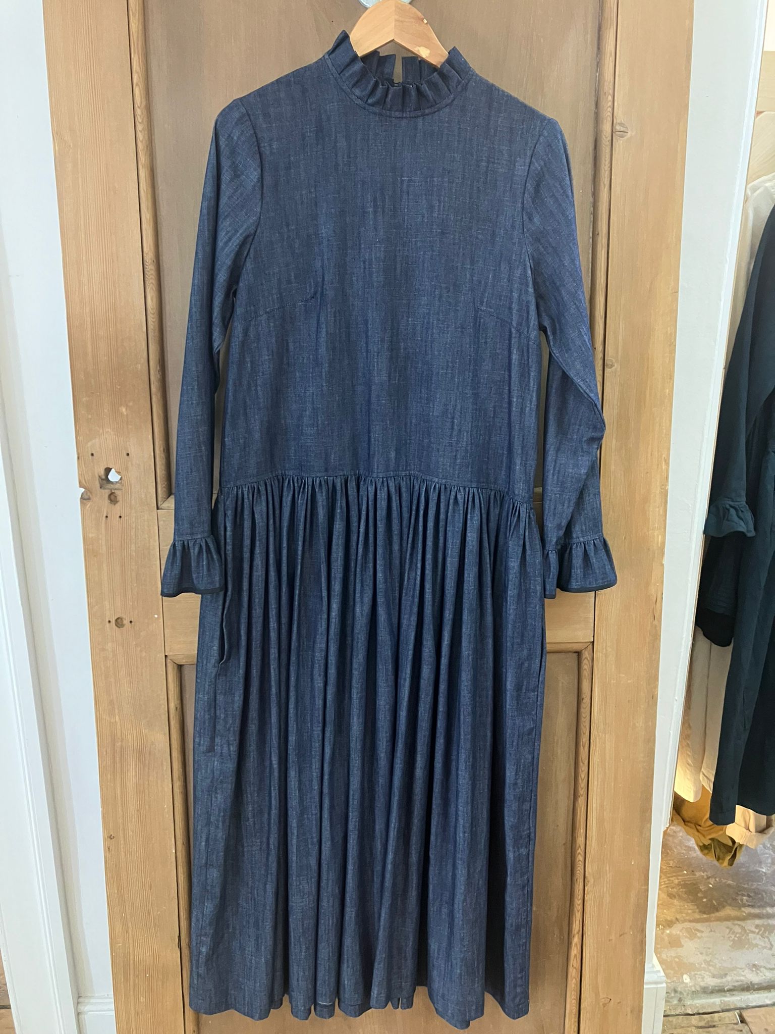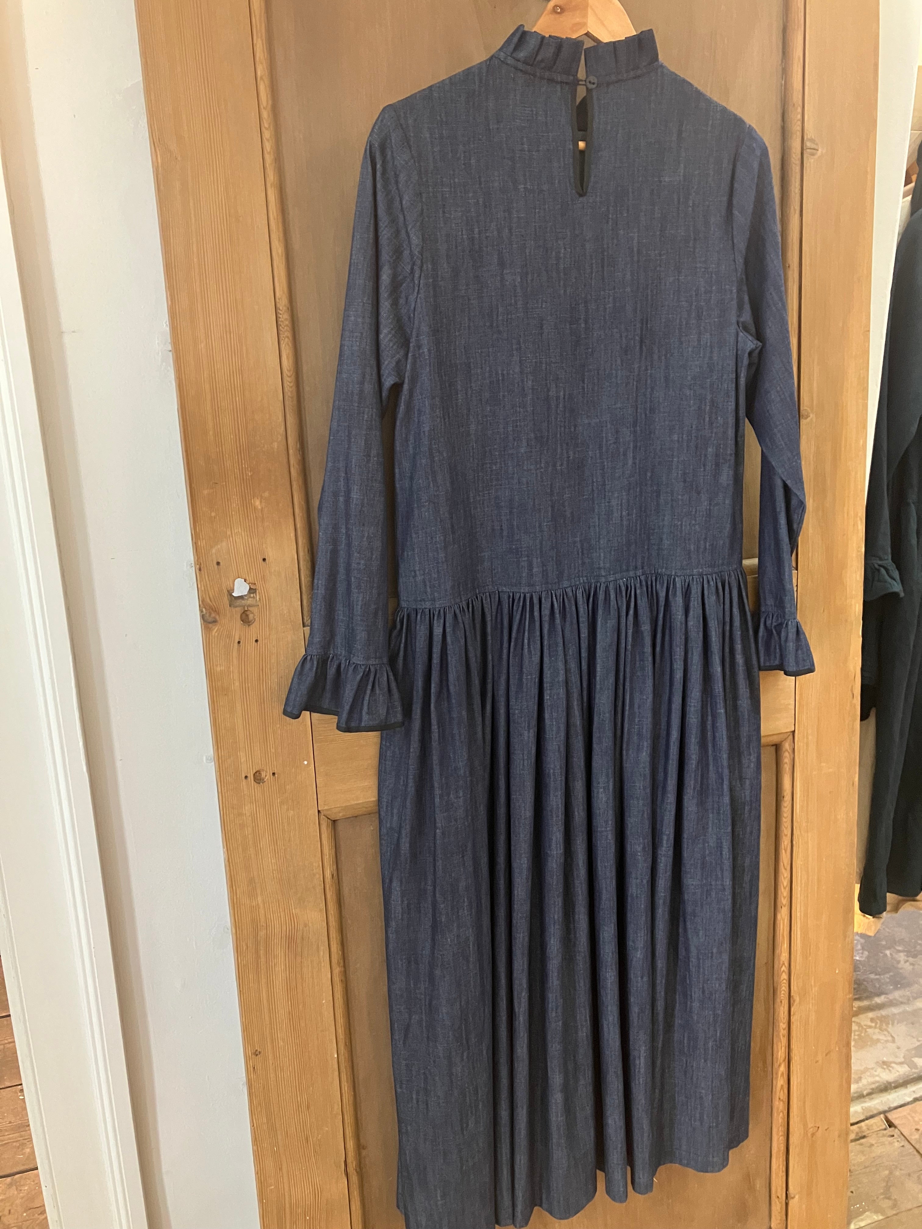 The Novelist is a more fitted dress, inspired by those worn by author Charlotte Brontë, made from raw organic stretch denim, which features a button fastening at the back neck and full length fitted sleeves. This organic cotton denim is 97% Cotton 3% Elastane