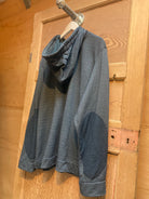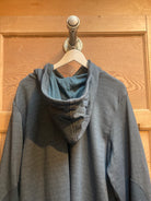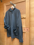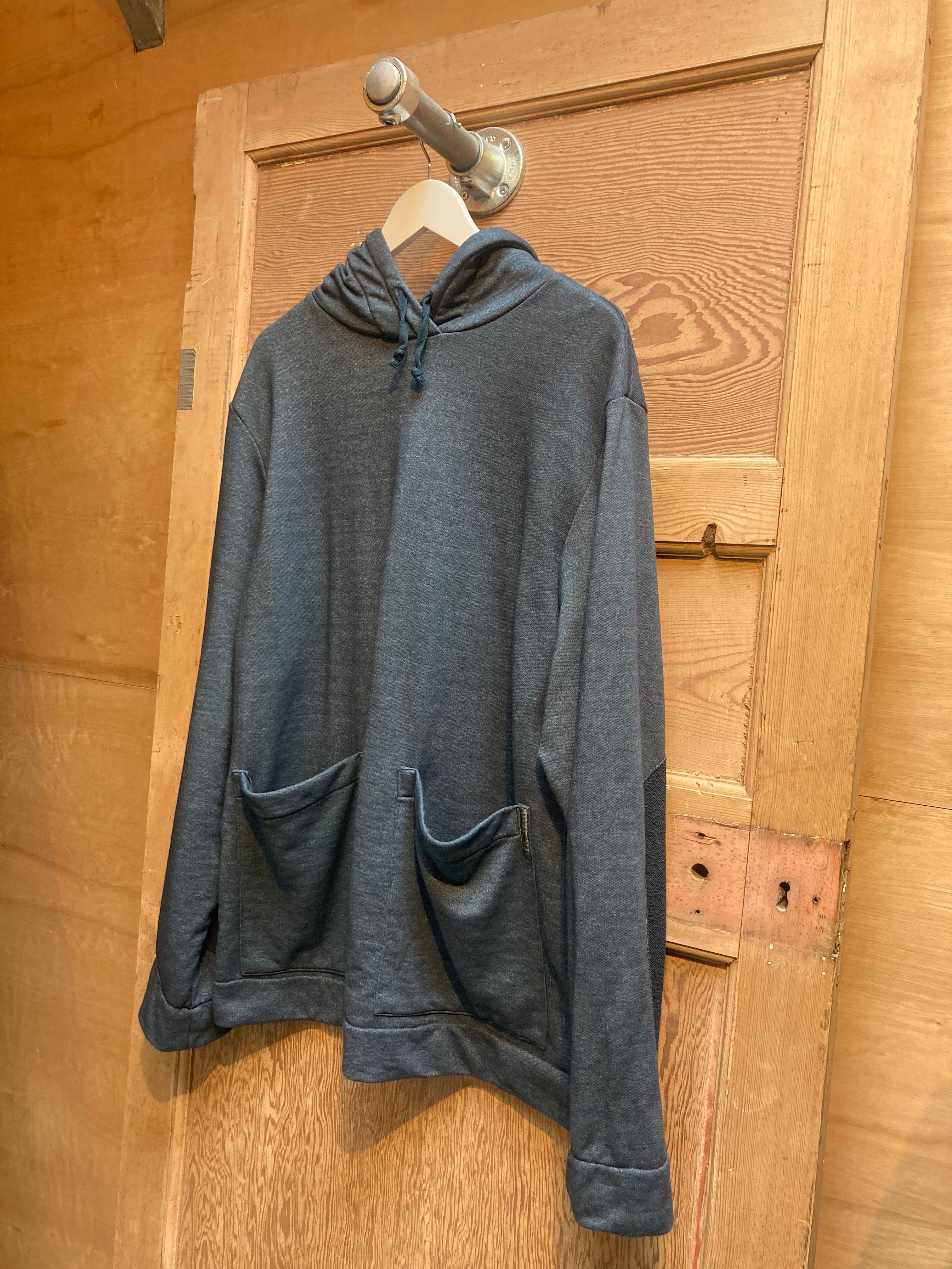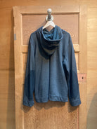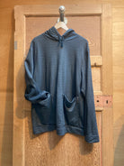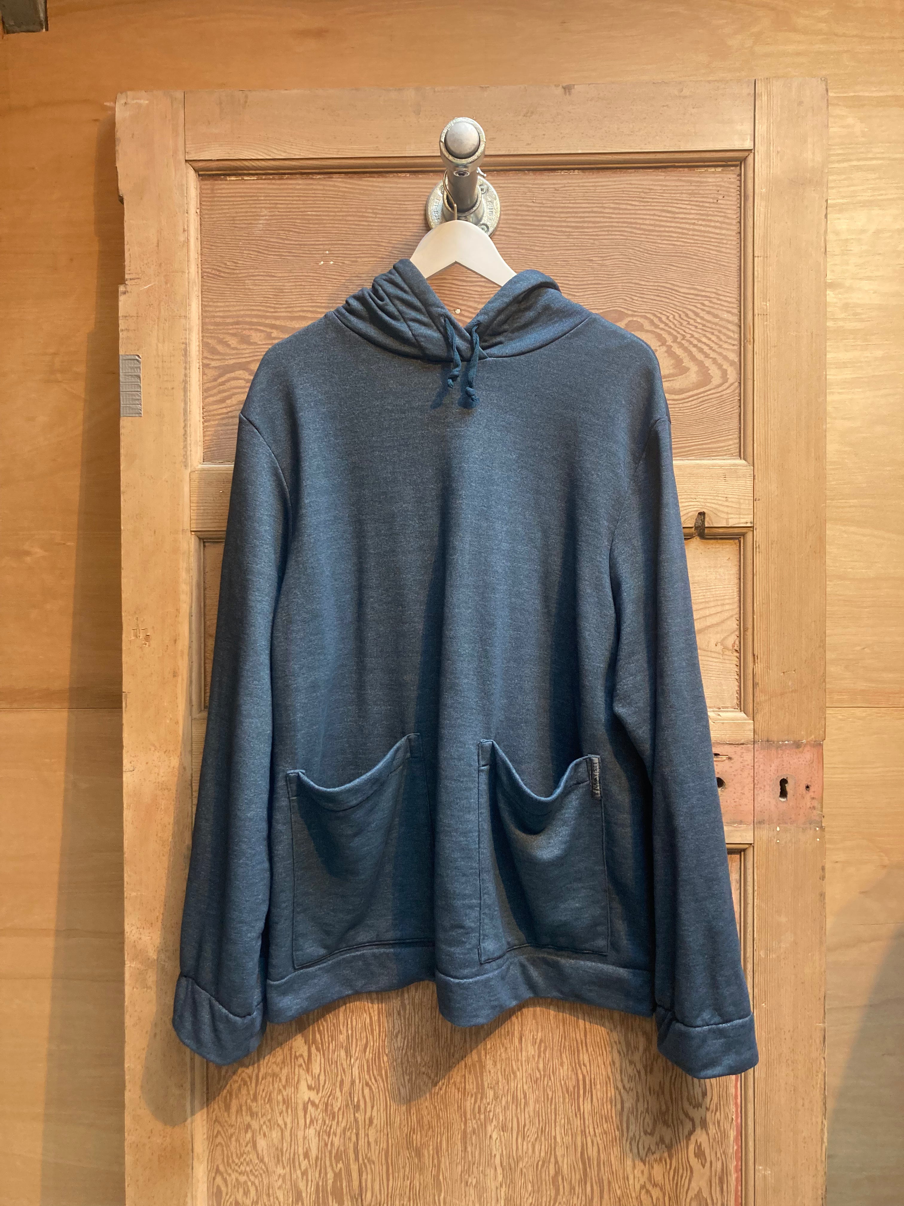 The garment dyed Hooded Artist Smock has elbow patches and a double hood with grosgrain at the back of the neck and grosgrain ties. There are side vents and patch pockets with deep cuffs and a deep hem. it is made from organic cotton sweat shirting mixed with recycled polyester. The loop back fabric is knitted in the UK. At 300g it is heavier and more compact than our standard sweatshirt fabric.