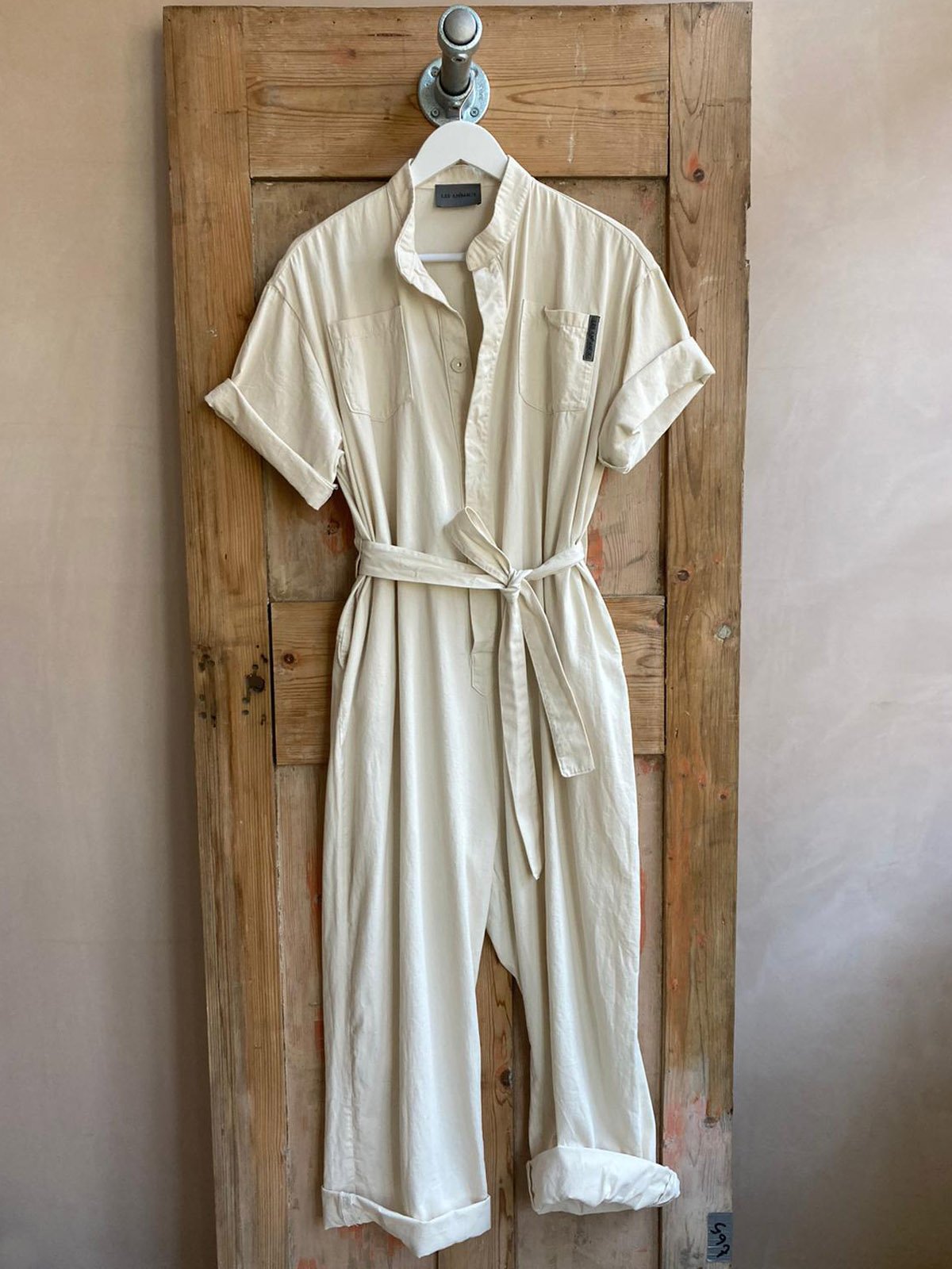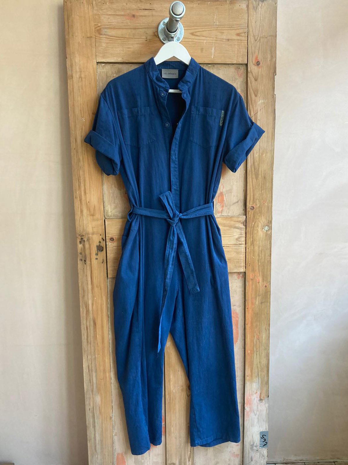 The sleeves can be worn rolled up or down. The waist belt can be removed or tied towards the front or back. The jumpsuit fastens with snaps for ease of use.
