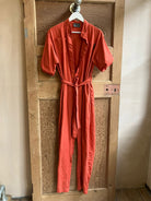 The sleeves can be worn rolled up or down. The waist belt can be removed or tied towards the front or back. The jumpsuit fastens with snaps for ease of use.