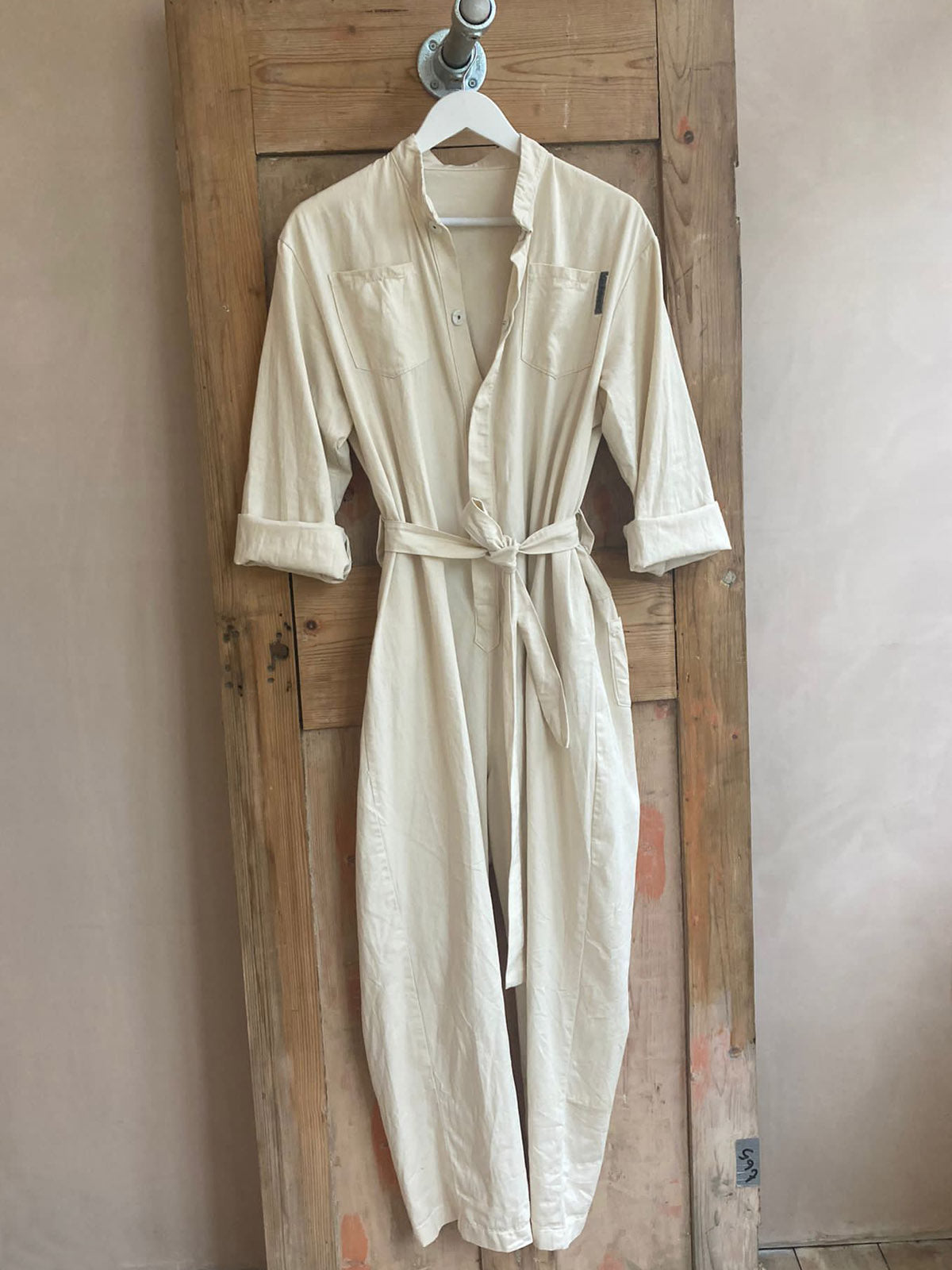 The sleeves can be worn rolled up or down. The waist belt can be removed or tied towards the front or back. The jumpsuit fastens with snaps for ease of use.