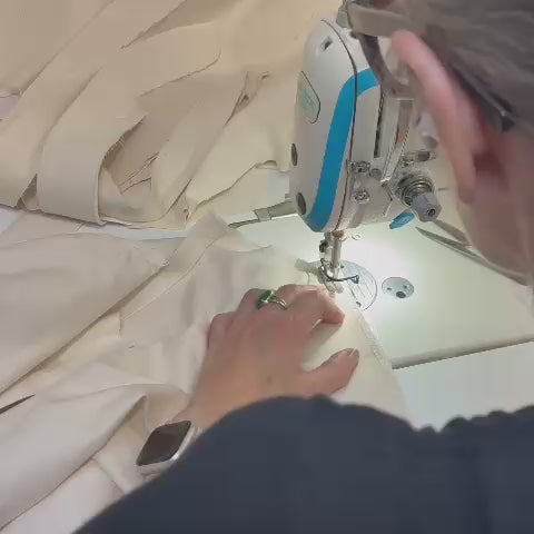 Our core fabrics are cotton drill in different weights and a cotton poplin. Both fabrics are certified organic and are imported from Turkey. We have textured fabrics and some hand woven fabrics that are sourced from a womans collective in Kerela, India. Our lighterweight cottons are a voile, lawn and a an Indian cotton. Another core cotton for us is an organic 14 corduroy from India.